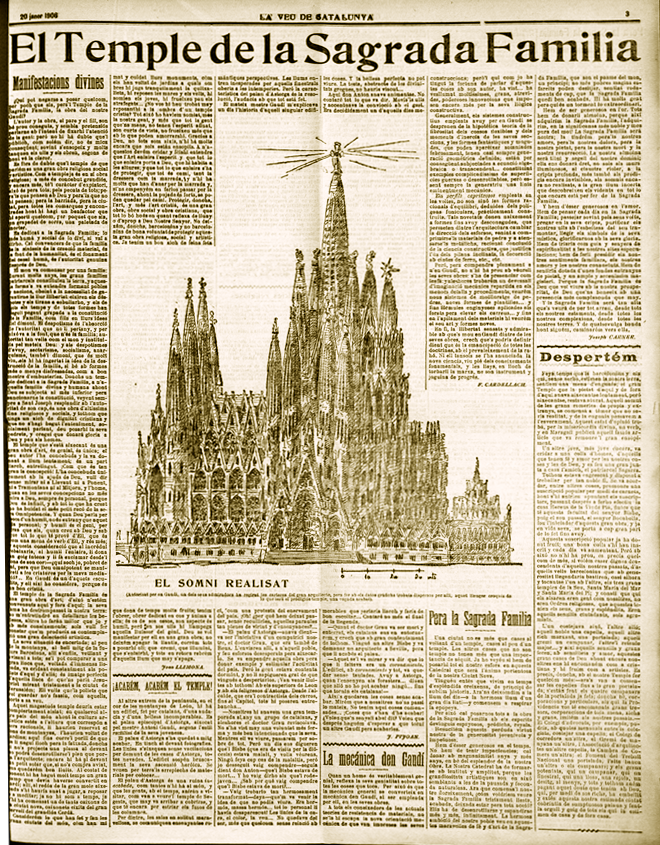 La publicació del primer dibuix de la Sagrada Família tal com seria una vegada acabada. La Veu de Catalunya, 20 de gener de 1906